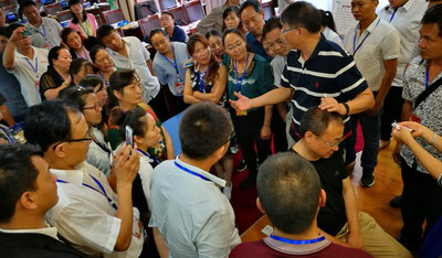 魏教授演示背部點(diǎn)揉法,基層醫(yī)生學(xué)員們將魏教授團(tuán)團(tuán)圍住,邊聽(tīng)邊看邊記錄,學(xué)習(xí)熱情高漲。演示模特均由學(xué)員自愿擔(dān)任,圖中女醫(yī)生當(dāng)時(shí)正好左上腹疼痛,經(jīng)魏教授點(diǎn)揉、拔/走罐等治療后,疼痛立解。立竿見(jiàn)影的治療效果大大提升了醫(yī)生們的信心。